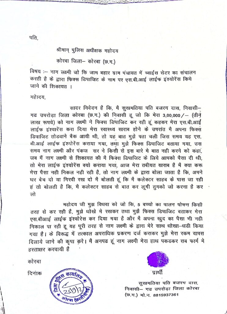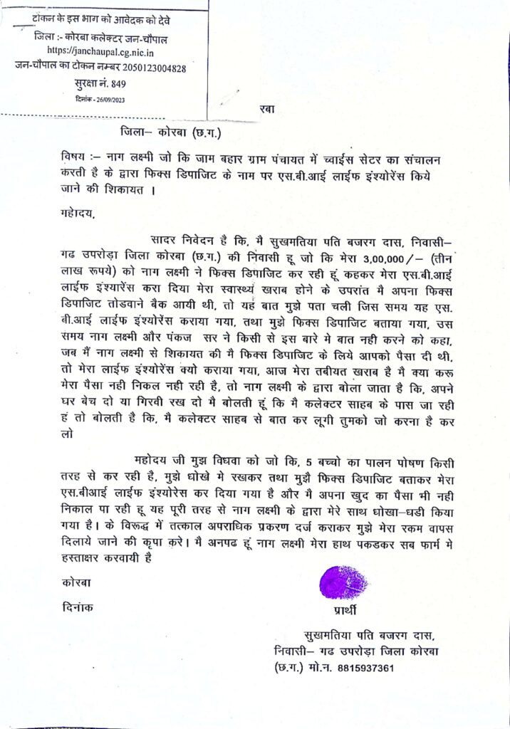 प्रखर राष्ट्रवाद न्यूज़। गुमराह और धोखाधड़ी के मामले सामने तो आते ही रहते हैं मगर ग्रामीण इलाकों में भी लोग इससे बचे नहीं हैं। पीड़िता बता रही थी कि वह गढ़ उपरोड़ा में रहने वाली सुखमतिया पांच बच्चों की मां जो विधवा है, जिसकी उम्र लगभग 40/42 साल है। उसके चार पांच बच्चे भी हैं अपने बच्चों का किसी तरह पालन पोषण करती है। अपने एक बच्चे की पानी में डूबने से मौत हो जाती है जो शासन की तरफ से 4/5 लाख रुपिया मिलता है। पीड़िता ने 3 लाख रुपए को फिक्स डिपॉजिट करने के लिए रखा। और बाकि रकमों का उस बच्चे के मरणोपरांत कर्म और निजी घरेलू खर्च के लिए रखा। अब उस 3 लाख रूपिए को बालको कियोस्क शाखा एसबीआई में फिक्स डिपॉजिट करने पहुंची। क्योंकि गढ़ उपरोड़ा से बालको नजदीक पड़ता है। कियोस्क शाखा ने को पीड़िता को लेकर ट्रांसपोर्ट नगर भारतीय स्टेट बैंक डीडी बनवाने पहुंचती है। इतने में बालको कियोस्क शाखा के नागलक्ष्मी नाम की मैडम ने उसे बहला फुसला कर एसबीआई लाइफ इंश्योरेंस कर दिया। सुखमतिया अनपढ़ है गंवार है। उसने कभी कोई फिक्स डिपॉजिट नहीं करवाया। उसे पता नहीं था कि शारीरिक जांच भी करवाया जाता है। अनपढ़ होने का भरपूर लाभ उठाकर नागलक्ष्मी ने उसे अपनी पॉलिसी का एक मेंबर बना लिया। 25/9/2023 को पैसे का आवश्यक काम फिर से उसके बच्चे का तबियत खराब होने से पड़ गई। इसी समस्या को लेकर वो अपने द्वारा किए हुए फिक्स डिपॉजिट को तोड़वाने आई तो उसे पता चला कि उसके साथ फिक्स डिपॉजिट के नाम पर धोखा किया गया है। इस बात को नागलक्ष्मी को पीड़िता बोलती तो नागलक्ष्मी का जवाब आता कि अगर पैसे की आवश्यकता है तो अपने घर को गिरवी रख दो, या तो फिर तुम्हें मरना पड़ेगा। इस बात को लेकर नागलक्ष्मी से पत्रकारों ने बात भी किया मगर नागलक्ष्मी बहुत चालाकी से जवाब को तोड़ मरोड़ कर देती और जिला कलेक्टर से खुद मिल जुल कर बात करने की बात भी खुलेआम कहती है। 26/9/2023 को इसकी सूचना और शिकायत जिला कलेक्टर और पुलिस अधीक्षक कोरबा को किया। और न्याय की भी गुहार लगाई।