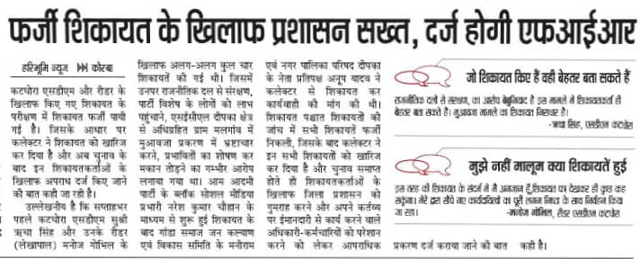 निर्वाचन आयोग रायपुर व दिल्ली तथा जिला कलेक्टर सौरभ कुमार ने की समस्त शिकायत खारिज कोरबा कलेक्टर सौरभ कुमार के कार्यों पर ग्राम मलगांव के लोगों को अब शंका होने लगी है। उनका कहना है कि जिला कलेक्टर ने बिना जांच के कैसे शिकायत को खारिज कर दिया। जबकि ग्राम मलगांव में पूछताछ के लिए कोई भी नहीं आया। वहां के परेशान लोगों का कहना है कि जिसका दर था वही हो गया और कलेक्टर भी जा मिला भ्रष्टाचारियों से तभी तो बिना जांच किए शिकायत को फर्जी करार दे दिया।