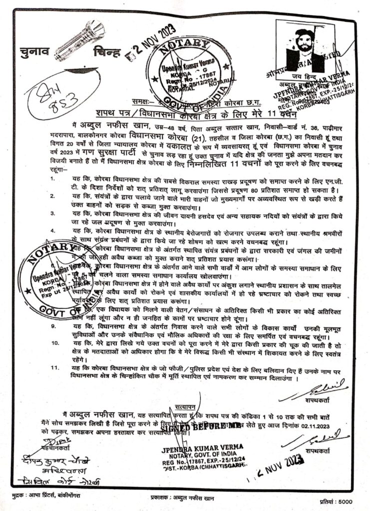 कोरबा विधानसभा क्षेत्र ही नहीं वरन् पूरे छत्तीसगढ़ विधानसभाक्षेत्रों में एक मात्र प्रत्याशी गण सुरक्षा पार्टी से अब्दुल नफीस खान अधिवक्ता ही हैं जो पर्यावरण प्रदूषण, रा खड़ से हो रही समस्या के मुद्दे पर चुनावी मैदान में हैं।