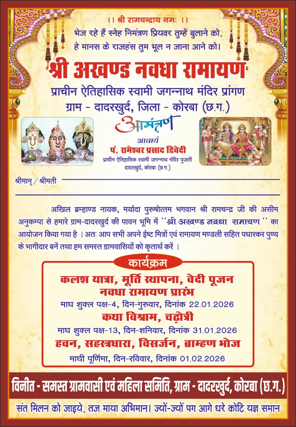 प्राचीन स्वामी जगन्नाथ मंदिर के पीठाधीश्वर आचार्य श्री कृष्णा द्विवेदी ने बताया कि पिछले 8 दिनों से दादरखुर्द में भव्य श्री अखंड नवधा रामायण का कार्यक्रम चल रहा है,आज विश्राम दिवस है,रात्रिकालीन भजन कार्यक्रम के कल 01 फरवरी को हवन,सहस्त्रधारा,विसर्जन,ब्राह्मण भोज के पश्चात कार्यक्रम की पूर्णाहुति होगी,इस भव्य कार्यक्रम सफल आयोजन में समस्त दादरखुर्द वासियों व प्रमुख रूप से महिला समिति का प्रयास अत्यंत सराहनीय है।प्राचीन स्वामी जगन्नाथ मंदिर के पीठाधीश्वर आचार्य श्री कृष्णा द्विवेदी ने श्री राम भक्तों से आग्रह किया है उक्त कार्यक्रम में सहभागी होकर पुण्यलाभ अर्जित करें।